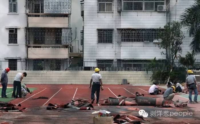 2015年11月,深圳外国语中学初中部校园内的塑胶跑道和操场开始人工铲除,此前这所学校的跑道塑胶被检测出甲苯超标。资料图剥洋葱:目前,社会对塑胶跑道行业意见很大。