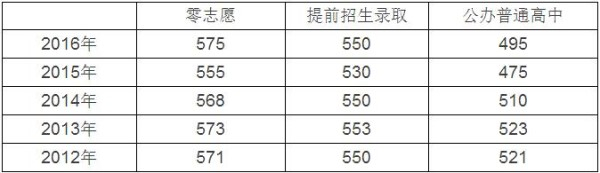 2012年—2016年上海市普通高中招生零志愿、提前招生录取和公办普通高中最低投档控制分数线:
