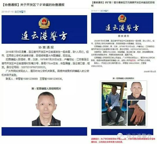 连云港警方发布悬赏公告和协查通报。 警方供图 摄