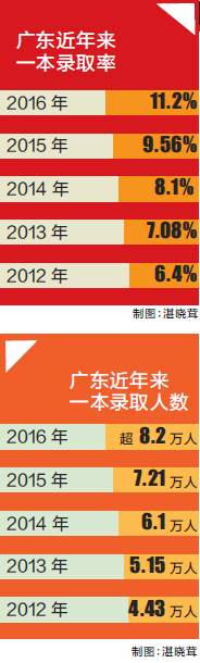 羊城晚报讯 记者王倩、通讯员粤考宣报道:从2012年的6.4%到2016年的11.2%,广东今年的高考一本录取率比预计的10%更高,实现了新的突破。据统计,今年第一批本科院校实际共录取考生8.2万多人,一本录取人数比上年增加1万多人,一本院校录取率达到11.2%,比去年提高1.64个百分点。