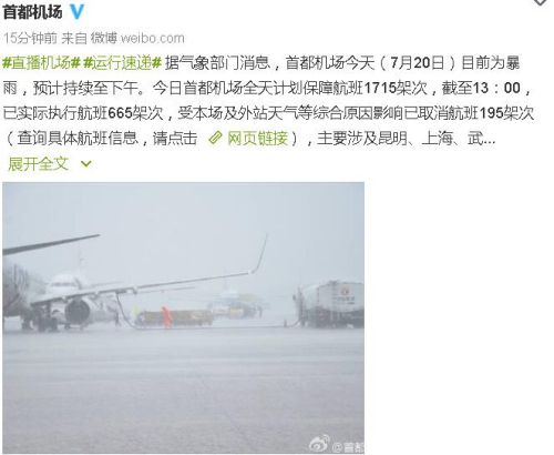 据气象部门消息,首都机场今天(7月20日)目前为暴雨,预计持续至下午。今日首都机场全天计划保障航班1715架次,截至13:00,已实际执行航班665架次,受本场及外站天气等综合原因影响已取消航班195架次, 主要涉及昆明、上海、武汉、深圳、大连等地。