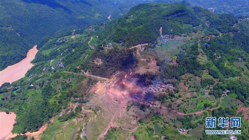 7月20日航拍的湖北省恩施市崔家坝镇水田坝村马家坡爆炸燃烧事故现场。图片来源:新华网