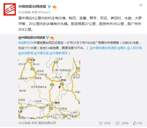 原标题:广西苍梧县发生5.4级地震 震中周边5公里有8个村庄