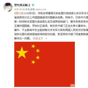 据中国驻里约热内卢总领馆官方微博8月9日早上发布的消息,中国驻巴西使领馆宋扬总领事8月8日再次致电里约奥组委公共关系主任阿杰玛大使,催询颁奖仪式上中国国旗错误问题解决进展。