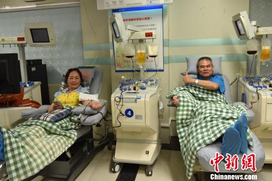 8月9日,广西南宁40余对情侣或夫妇“组队”去献血。图为南宁首对“五星级献血之星”韦沛常(图右)、龚艳弟夫妇。 石艺臻 摄
