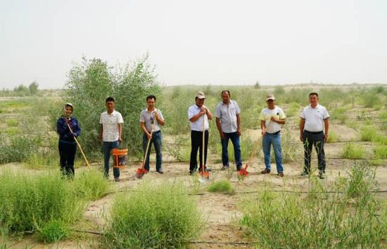记者了解到,且末县自四年前起开始在河东基地大面积种植白梭梭,并在相继其根部接种荒漠肉苁蓉、黑枸杞、西瓜等经济作物。且末县还制定多项优惠政策吸引社会力量参与防沙治沙。目前,已经有七家民营企业进入,不仅加快了当地生态建设的步伐,而且还吸纳大量当地人就业。