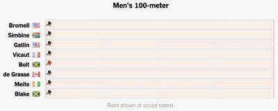 而在加速度方面,博尔特从起跑到加速至最高速度,只需要1.61秒,少于绝大部分短跑名将。