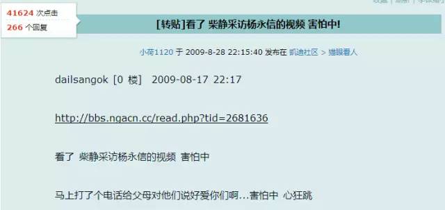 也是在2009年,柴静就对杨永信进行过采访,栏目当时揭露了其中心主要通过“捆绑监禁、电击酷刑、重复洗脑、限制自由、个人崇拜、互相批斗”等手段,对“网瘾少年”进行治疗。该消息被公开后,轰动全国,舆论界骂声一片。各大贴吧等互动交流平台,成为网民对此事讨论的主要阵地。时至今日,依旧能在过去的贴吧内,感受到人们当时“恐惧”的心理。