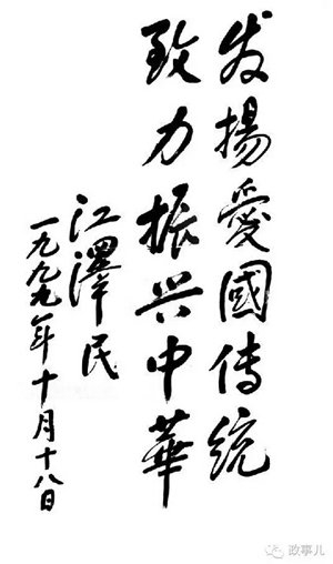 1999年10月,江泽民考察国务院参事室,并题词“发扬爱国传统,致力振兴中华”。