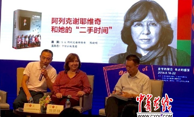 ????中青在线上海8月19日电 (中国青年报·中青在线记者 张茜 周凯)今天,2015年诺贝尔文学奖的获得者白俄罗斯记者、作家S.A.阿列克谢耶维奇现身上海书展,并与北京大学文学系教授陈晓明围绕她获奖后在中国出版的首部作品《二手时间》进行对谈,讲述自己的写作秘诀。