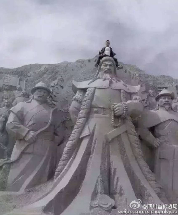 在青海某景区游览时,攀爬主题雕像照相,并将照片在网络上传播,造成恶劣社会影响。