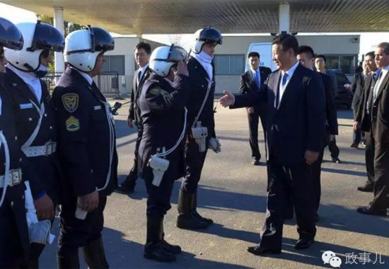 43小时的阿根廷之旅结束后,20日上午,访问即将结束,佩戴头盔、全副武装的骑警车队护卫到埃塞伊萨国际机场外,得知骑警们按规定不进机场,习近平临时要求停车,来到骑警们面前,同他们一一握手道别表示感谢,并合影。
