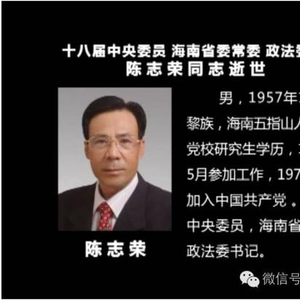 昨晚的《海南新闻联播》公布了一则噩耗:十八届中央委员,海南省委常委、政法委书记陈志荣因病医治无效,于2016年8月28日12时在北京逝世,享年58岁。