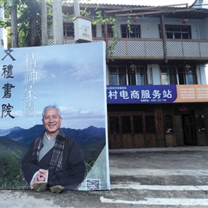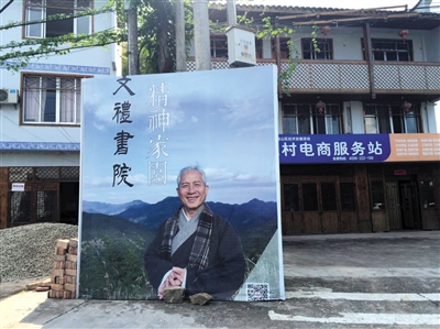 文礼书院门前,王财贵的巨幅广告牌立在丁字路口。新京报记者 罗婷 摄