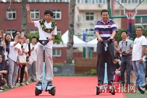 开学典礼上,一对父子骑着电动两轮平衡车走红地毯。