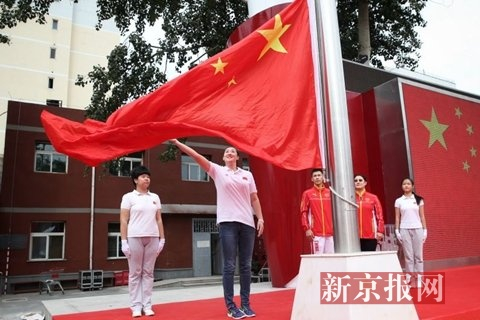 上午9点许,2004年雅典奥运会中国女排队员宋妮娜、2008年北京奥运会25米手枪射击冠军陈颖、2012年伦敦奥运会体操男团冠军张成龙三位奥运冠军与部分学生在长椅上合影,随后身披国旗走上开学典礼舞台。