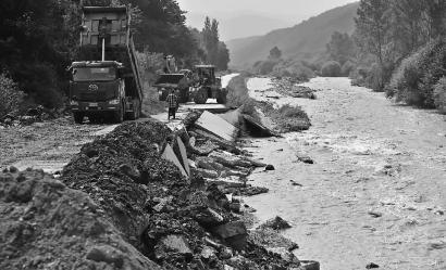 由于连续降雨,洪水湍急,加固路基的巨石刚投下就被冲走。9月1日水位明显下降,上午11点钟道路恢复通车,满足抢修条件,公司立即组织30多名工作人员进驻施工地段,开展抢修工作。