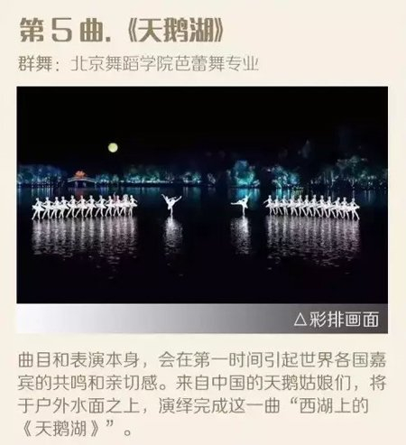 据晚会总导演张艺谋“剧透”,文艺演出是“实景演出的交响音乐会”,为国内首次在户外的水上舞台举办大型交响音乐会,毕竟“诗情画意只有在西湖上才是匹配的”。