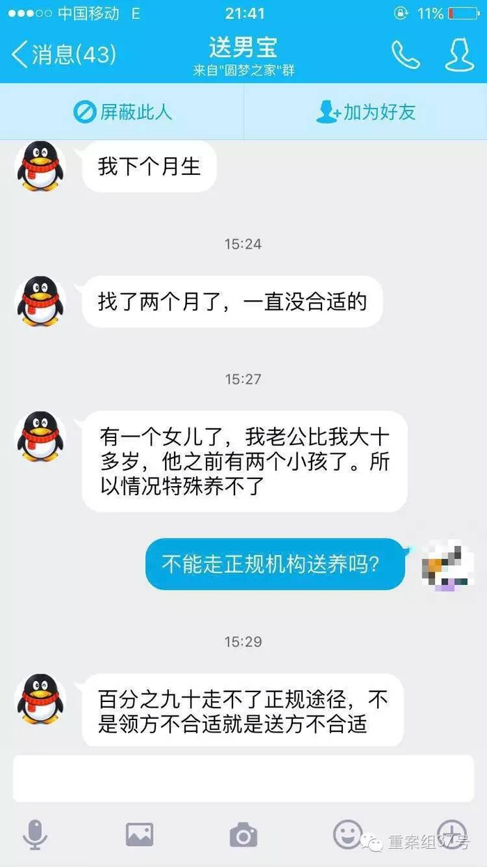 为何不走正规途径?重案组37号(微信ID:zhonganzu37)向数名群友抛出这个问题,却没有得到正面回应。“送男宝”表示,“群内百分之九十走不了正规途径,不是领方不合适就是送方不合适。”大家都知道不合法,但是“双方都不说就不会有人知道。”