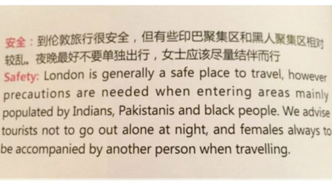 据报道,中国国航在其空中月刊《中国之翼》中提示称,“到伦敦旅行很安全,但有些印巴聚集区和黑人聚集区相对较乱。夜晚最好不要单独出行,女士应该尽量结伴而行”。