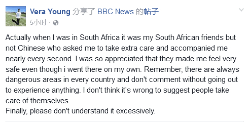 事实上,当我在南非的时候,恰恰是南非的朋友而不是中国同胞提醒我要多长一个心眼,并陪伴我左右。尽管独自外出,但他们仍让我感到很安全,我很感谢他们。记住,所有的国家都会有不安全的地方,不要坐井观天又要品头论足。我并不觉得提醒大家自我保护的建议是错的。最后,别过分解读。
