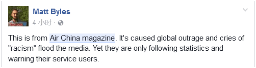 网友Matt Byles:这是中国国航的杂志,在一些媒体铺天盖地地报道后,它引发了人们的愤怒并被称“种族主义”,但是,他们也只是根据一些数据,提醒客户而已。