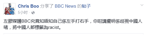 网友Chris Boo:BBC究竟知不知道自己是在左手打右手,你这样讲摆明是歧视中国人啊,将中国人都标签为种族主义者。