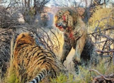 到了第二天早上,他们突然听到非常响亮的吼叫声,赶到现场发现两只老虎在芦苇地里打架。这个场面十分可怕,老虎的身上都是泥土、血和水。其中一只老虎以为另一只老虎已经被咬死了,所以它停止了撕咬,但被咬的那只立刻抓住机会反击。它们就这么不停地追打撕咬。”经过45分钟的打斗之后,胜负终于分出,更年轻、更强壮的那只老虎取得了胜利。