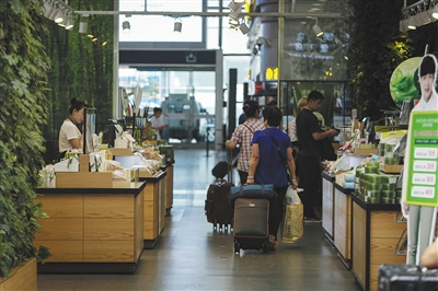 8月11日,旅客们拉着行李箱穿过进站口旁的商铺,过多的商铺挤占了乘客候车空间。
