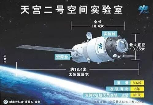 “天宫二号”是我国第一个真正意义上的太空实验室,采用实验舱和资源舱两舱构型,全长10.4米,最大直径3.35米,太阳翼展宽约18.4米,重8.6吨,设计在轨寿命2年,在“天宫一号”目标飞行器备份产品的基础上,为满足推进剂补加验证试验需要,对推进分系统进行了适应性改造;为满足中期驻留需要,对载人宜居环境进行了重大改善,具备支持2名航天员在轨工作、生活30天的能力。“天宫二号”装载了空间冷原子钟等14项应用载荷,以及失重心血管功能研究等相关航天医学实验设备,配备在轨维修技术验证装置、机械臂操作终端等在轨维修试验设备,将开展空间科学及技术试(实)验。