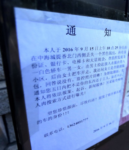 事后,张先生报了警,并在事发次日,在小区门口张贴了3张告示。告示中简述了时间地点、事发经过,并在最后写道:“监控照片清晰!为(给捡钱包者)留取颜面,先通知您,5日内把不是你的东西还于主人。如果不还,本人将依法报案、起诉、(反映给)新闻媒体!另采取全网络人肉搜索方式进行曝光!望您珍惜颜面,尽快归还!”