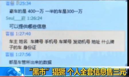 一个叫“诚信数据”的人主动向记者兜售车主信息,豪车车主标价400元一万条信息,普通车车主300元一万条。“诚信数据”为了证明自己的“诚信”,主动给记者发过来多条车主信息验货,包括车主的姓名、车牌号、手机号、车架号、发动 机号。拨打这些车主的手机后,记者发现这些信息全部是真实的。此人声称自己还出售个人全套信息,从身份证复印件、家庭成员、户口本复印件、到网络账户名都在其中,全套信息的价格是每套3元。