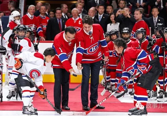 两名分别穿着红色和白色球衣的男女小队员,在两位总理面前演示冰球运动。之后,李克强和特鲁多穿着皮鞋踩上冰球场,双手握着球杆,大笑着共同挥杆为小球员们开球。