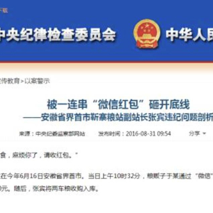 随着执纪越来越严,“四风”也在不断改头换面,“躲”进虚拟空间的违规电子红包就是其中的新表现。8月31日,中央纪委监察部网站公布安徽省界首市靳寨粮站副站长张宾违纪问题剖析。
