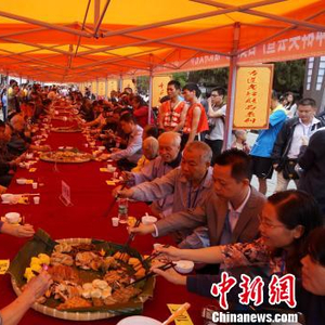 广西贺州摆1.6公里簸箕宴 游客与老人共享美食