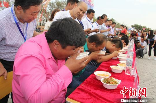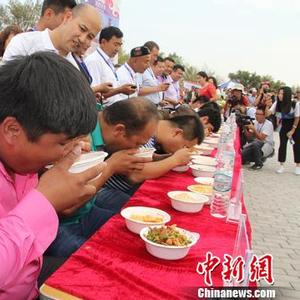 每年的吃拌面比赛(也称大胃王“争霸赛”)无疑是拌面文化旅游节上的一大亮点。在今年的比赛中,帕尔哈提·艾尼瓦尔用39秒吃完两份拌面,第四次获得中青年组比赛的冠军;66岁的闻玲老人以1分22秒获得老年组(60岁以上老年人)的冠军。