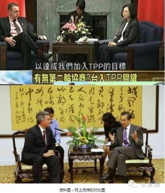 网络流传两张翘脚照:蔡英文与美国议员见面,蔡英文双腿并拢,对方翘脚;美国人在中国大陆见官员时,美国人双腿并拢、中国大陆官员翘脚。蔡英文女士和王毅先生都是在自己“家里”,一个感觉拘谨,反倒像做客,一个有“主人”气派,看起来地位就不一样啊。