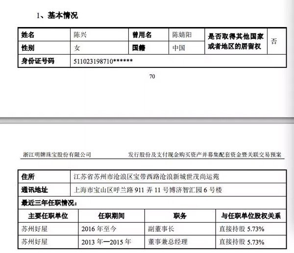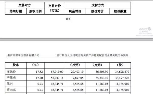 汪妹玲、严伟虎夫妻以外,陈兴是这次交易中的另一位大赢家。根据交易预案,陈兴将获得1.8346亿元的对价,其中直接拿到现金6565.68万元,另获1116.6万股明牌珠宝股票,折合市值1.178亿元。