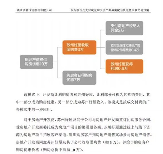 本次明牌珠宝的收购预案里,好屋阐述了其模式对房产经纪人的反馈:房地产商提供10万元优惠,购房者向好屋缴纳3万元电商费后可获得7万元优惠;好屋获得3万元电商费后,向房产经纪人支付2万元涌金,平台获得0.6万元。