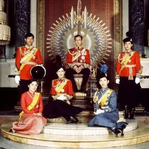 王座上的泰王,右手边为王储哇集拉隆功,左手边为女王储诗琳通。前面坐着王后诗丽吉以及大女儿乌汶叻公主和三女儿朱拉蓬公主。