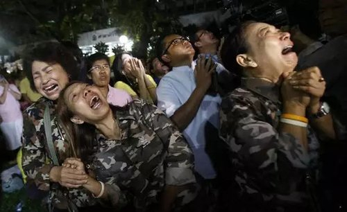 泰国国王普密蓬深受民众爱戴。当晚,成千上万名泰国民众聚集在普密蓬国王就医所在的诗丽叻医院外,听闻国王去世的消息许多人痛哭落泪。