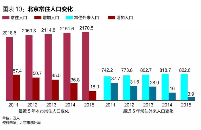 1994年以来,北京市常住人口进入快速增长阶段。20年来,北京常住人口规模几乎增长了一倍,年均增长49.79万人。但从2011年开始,北京常住人口增幅已经连续五年下降。2015年末,北京常住人口为2170.5万人,比上年增长18.9万(见图表10)。
