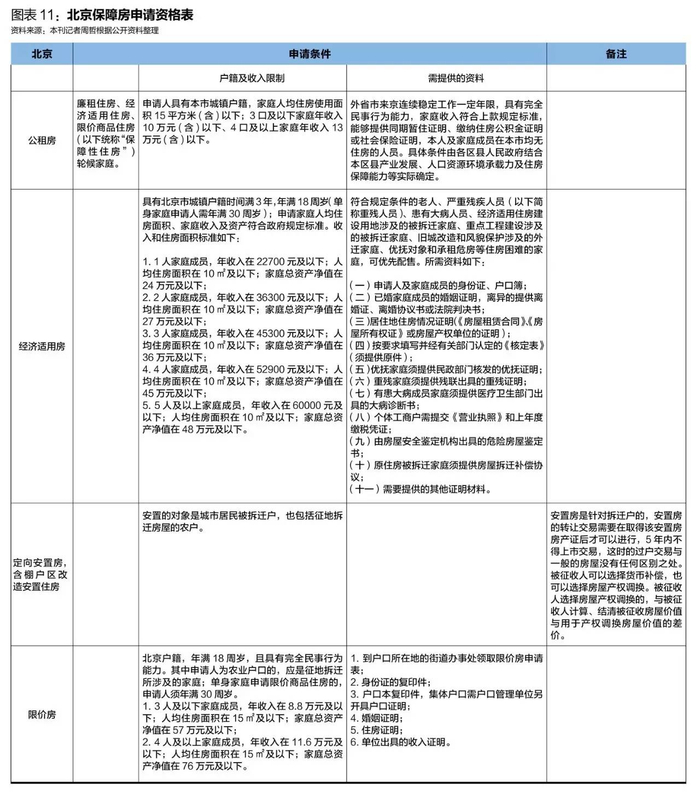 如今北京保障性住房主要分为四类:公共租赁住房、廉租住房、限价商品住房、经济适用房。不过,这些住房保障的是本地居民,北京市户口是申请保障房的前提,申请条件也非常严格(见图表11),只能惠及很少部分人,这使得保障房失去对商品房价格的影响力。