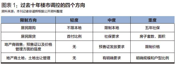 回顾十年楼市调控,主要措施集中在四个方向:限贷限购抑制需求、放房放地增加供给,这是两个主要方向;加强市场秩序管理打击哄抬房价行为、加强舆论引导预防房价恐慌心理蔓延,这是两个辅助方向。不同时期,以上措施出台的力度不同(见图表1)。但总的来说,可谓抑制需求的一手硬,增加供给的一手软,加上其他宏观经济因素,因此房价总是不按调控者的意图行走。情急之下,某些房价涨幅高、舆论关注强的城市,政府甚至直接出手,剥夺开发商的新房定价权,从而实现房价的“统计回归”。