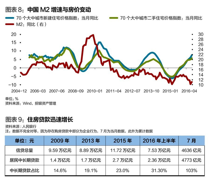 招商银行资产管理部研究团队的研究显示,情况并非全然如此。过去12年,M2增幅与房价增幅在多数时候都呈正相关关系,但2015年之后,情况发生了变化,M2 增速下滑的同时,房价上涨则在加速(见图表8)。