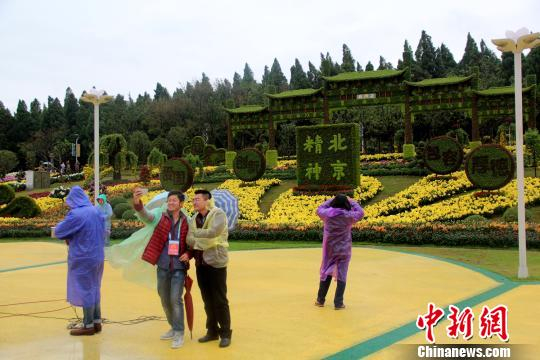 图为菊展现场,北京菊展造型前民众合影留念。 钟欣 摄