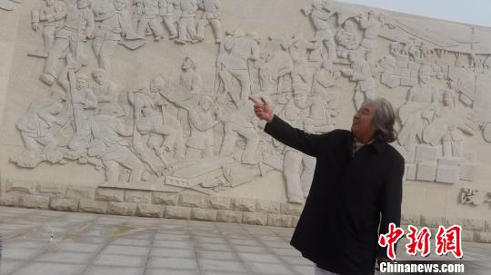 图为程彪在巨型石浮雕前讲述创作历程。 付立冬 摄
