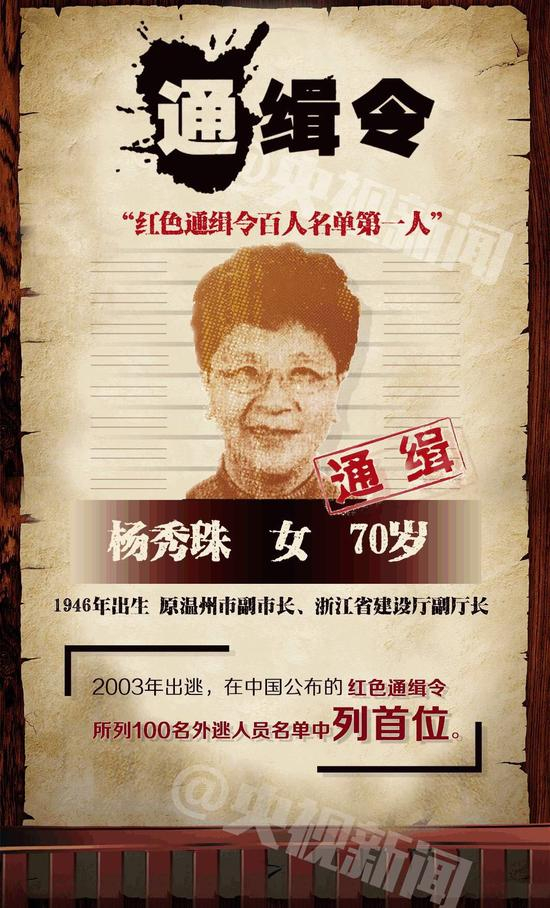 杨秀珠,女,1946年出生,浙江省建设厅原副厅长,涉嫌贪污犯罪,国际刑警组织红色通缉令号码A-745/7-2003。