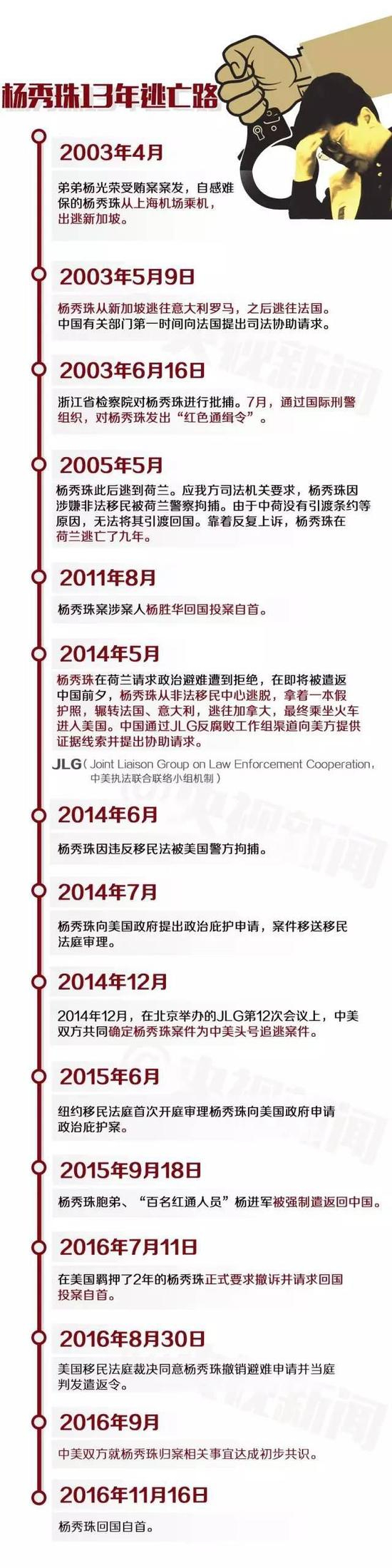 2016年11月16日,在中央反腐败协调小组国际追逃追赃工作办公室的统筹协调下,经中央有关部门和浙江省追逃办密切协作,潜逃海外13年之久的“百名红通人员”头号嫌犯杨秀珠回国投案自首。这是第37名归案的“百名红通人员”。