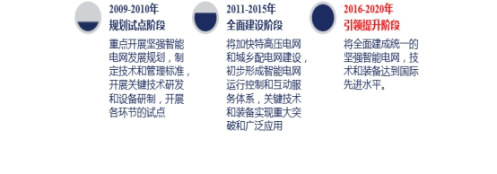 根据国家电网2010年5月公布的我国智能电网发展计划,智能电网在中国发展将分三个阶段逐步推进。具体如下所示:
